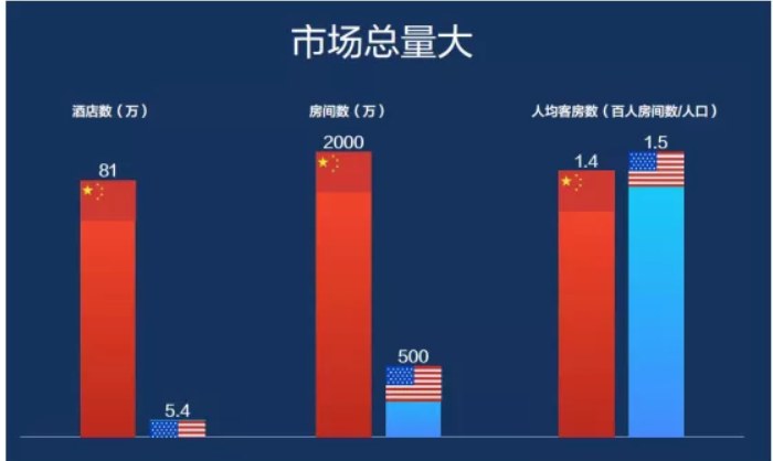 但从酒店全行业的情况来看,增长远远不是这些宏观经济数字所展示的如此乐观。从季琦分享的数字(详见下图)来看,作为全球最大的两个单一市场,中国酒店数是美国的15倍,房间数是美国的4倍,每间酒店房间数仅仅略高于美国的1/4,连锁化率不足美国的1/4(中国17%,美国70%),总体呈现了市场总量大,单体规模小,连锁化率低,盈利能力弱等特点。