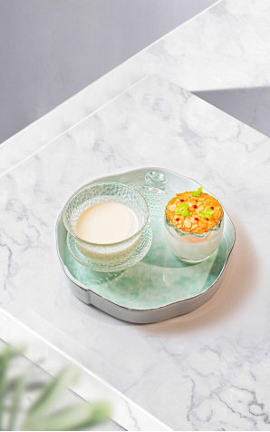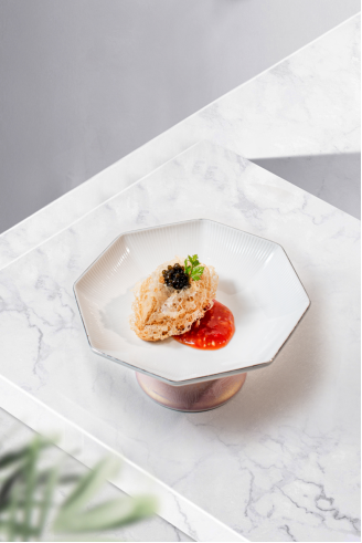 在传统手艺与现代审美之间,唐阁始终寻求平衡与突破。「翡翠鲜虾饺」延续经典而形制愈加凝练;「鱼子酱三鲜炸芋果」以酥松芋泥为基,缀以鱼子酱的咸鲜一跃,在质感对比中见和谐。每一道点心皆以手作温度,传递粤点文化的静雅与深度。