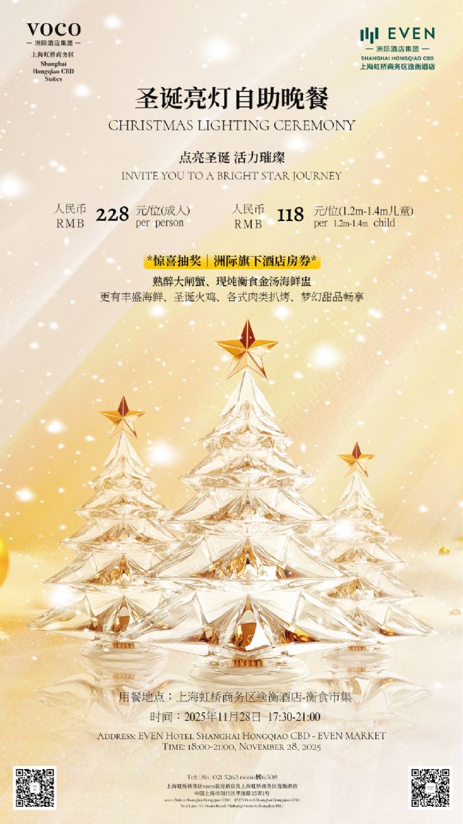 点灯仪式及自助晚餐时间为17:30–21:00,售价228元/位,预订咨询电话:021 52636666上海虹桥商务区voco套房酒店与逸衡酒店致力于打造妙趣健康的节庆空间,让每位宾客在自在氛围中共享欢聚时光。