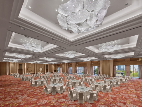 酒店大宴会厅以1380平方米的无柱开阔空间,配以挑高设计,可轻松容纳千人盛宴,犹如一幅徐徐展开的巨幅画卷,融合先进影音系统与灵活璀璨灯光布局,营造沉浸式感官体验,为各类活动提供兼具气度与美感的理想场域。