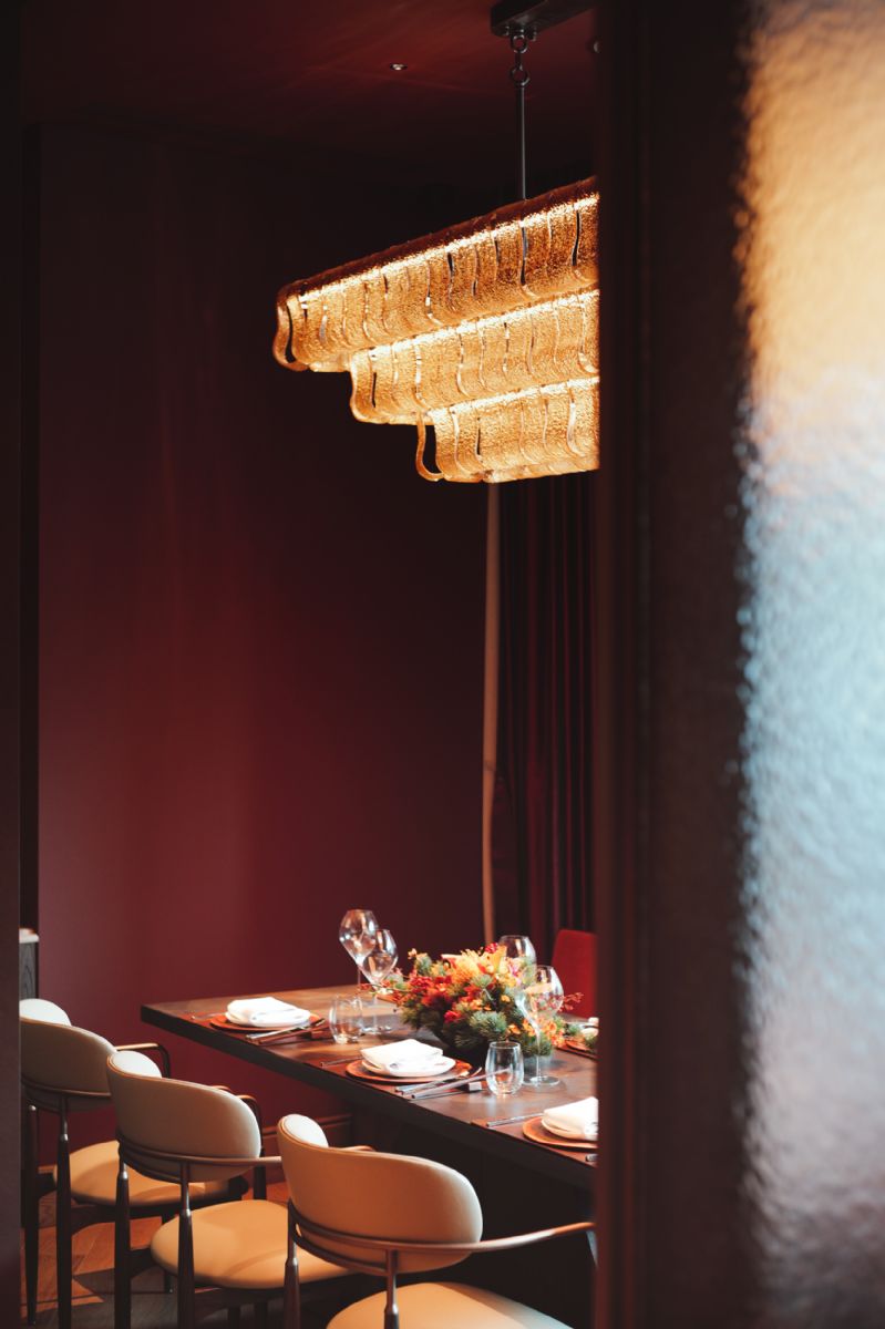 私宴包厢空间由来自澳洲的Mitchell & Eades设计工作室担纲,以叙事美学融汇隽永精致与当代人文体验,汲取上海文化之包容流动与东西方设计美学的流影交融,为宾客打造蕴含当代上海气韵的餐饮空间。设计灵感不仅源于旗袍轮廓,更深入其精妙细节:盘扣的匠艺在定制家具上得到体现;面料丰富的纹理与图案,塑造了吧台与茶艺区触感细腻的细节装饰。这一演进的设计语言延伸至装饰艺术风格,在灯具、座椅、餐具、地毯和其他装饰品的形态中得以重新诠释,令私宴包厢于几何细节间平衡亲密惬意与仪式感,铸就摩登优雅的用餐雅境。