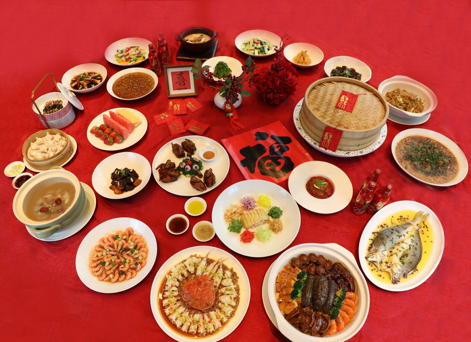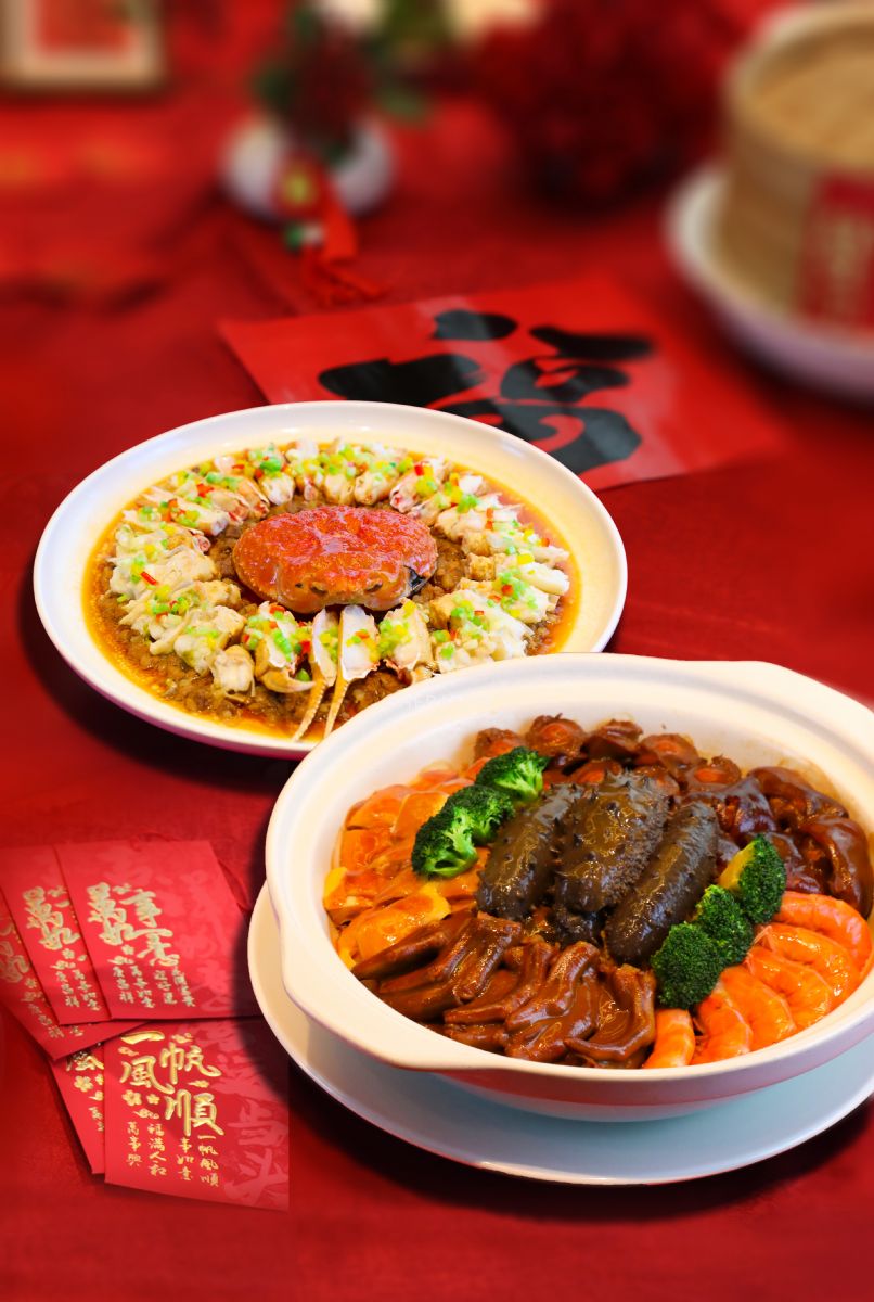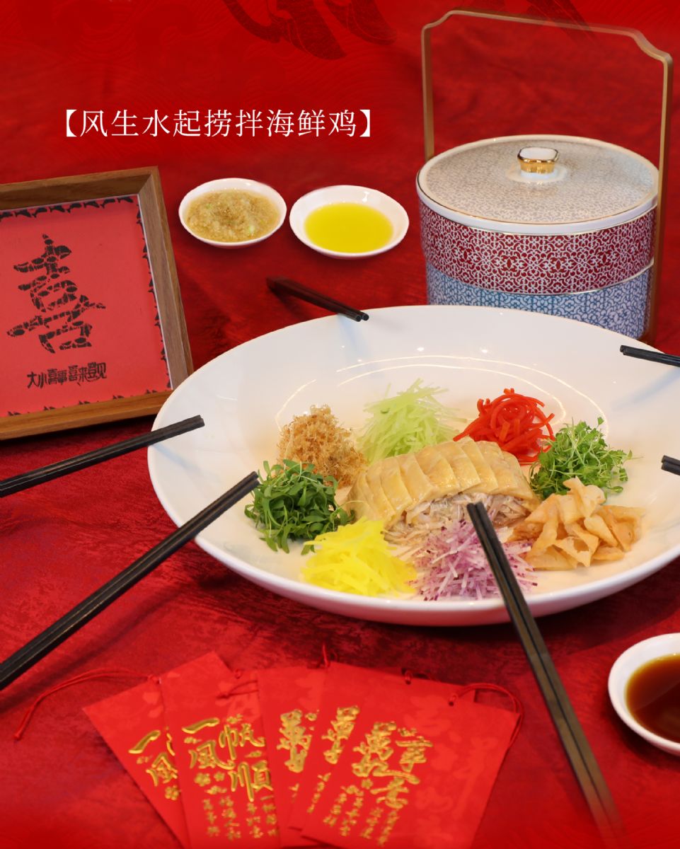 主厨甄选直击味蕾——手打黑豚肉蒸松叶蟹、大红袍鸡油蒸大陈黄鱼、沙蒜豆面、台州腊味三宝,“风生水起” 捞拌海鲜鸡端上桌,便漾开新年的热闹彩头;采悦轩全家福大盆菜层层堆叠,寓意 “团圆欢聚、盆满钵满”,添就了新年的热闹彩头。