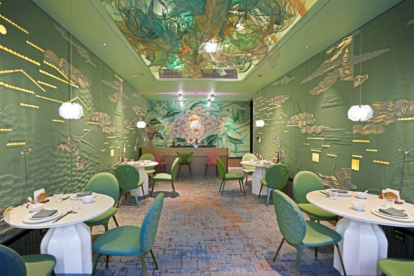 步入餐厅,玉色青绿为主调的空间徐徐展开,山水云海层叠铺陈,光影流转间宛若星河入梦。中央盛放的锦花艺术墙成为视觉焦点,层层花瓣在光影中绽放,将“花光似锦”的画面定格于当下,为人间烟火中的好时光与好滋味,铺陈一方如画底色。