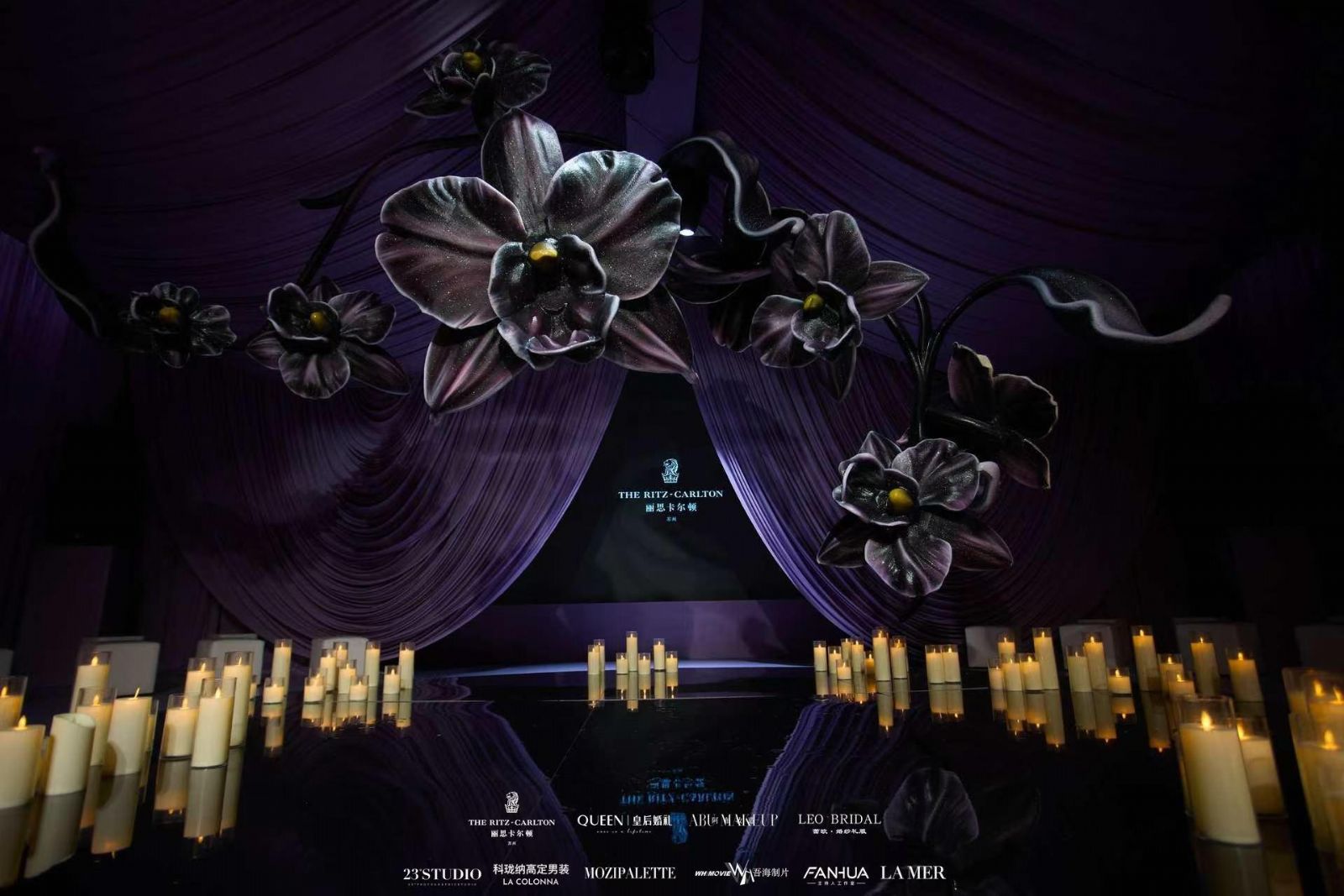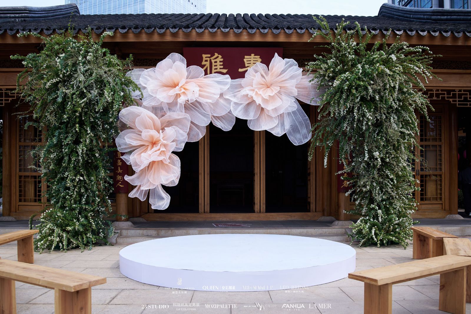 本次婚礼秀设酒店宴会厅室内秀场与紫芝园户外布景,演绎双重浪漫。宴会厅内以黑兰花巨型装置为视觉焦点,与 “白玉缀枝头,一树尽是春”诗意相映;空间装置萃取 18 世纪欧洲舞会礼服纹饰,结合巴洛克 “珍珠” 本义与三叠式晚礼服轮廓,既脱胎于古典,又彰显现代艺术感,与豆蔻紫、雅金、象牙白的色调碰撞出独特格调。户外紫芝园以 “在水一方” 为主题,将传统园林花窗与现代花艺装置结合,春日繁花于曲径通幽间绽放,微风拂过,暗香浮动,尽显姑苏独有的婉约与悠然,为户外婚礼仪式打造出 “一步一景,一景一情” 的诗意天地。紫芝园、紫芝桥等打卡点更设置书写幸福扇、春日祈福放河灯、投壶套圈等趣味环节,让来宾以及准新人们在沉浸式体验中感受江南婚典的独特韵味。