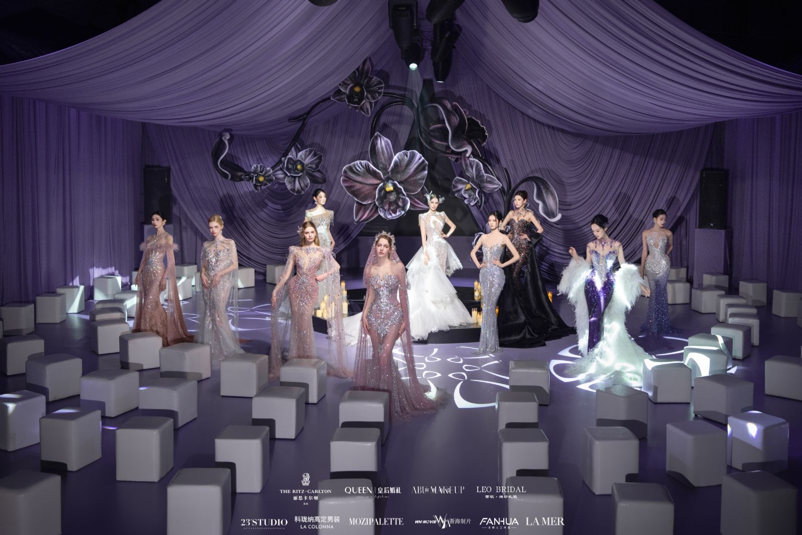秀场环节,模特身着夺目礼服,在璀璨光影中优雅登场,将现场氛围推向高潮。随后,皇后婚礼策划团队登台分享,深度解读品牌服务理念,剖析前沿婚礼流行趋势,并针对主题定制等核心环节,为准新人提供了专业的策划思路。
