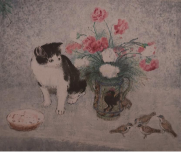 《捕捉之前》——画面中心绘制了五只麻雀,一只黑白毛色相间的花猫,其间放置了一个插满鲜花的瓶子,以及放在桌子上的烟灰缸,它们之间形成了经典的三角形构图。猫的双眼炯炯有神,直视猎物,右前爪匍匐,左后爪后蹦,随时欲向前捕捉麻雀,而麻雀仍悠然自得,在一紧张,一轻松之间形成强烈对比。