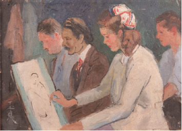 《画室》——潘玉良常赴巴黎大茅屋画室习作,与各国艺术家共同练习人体写生。大茅屋画室始建于1904年,它以大胆自由的教学理念与传统学院派相抗衡,中国20世纪上半叶到法国留学的艺术家如林风眠、潘玉良、常玉、吴冠中等具有现代艺术风格的艺术家几乎都选择了大茅屋画室开展自由习作。