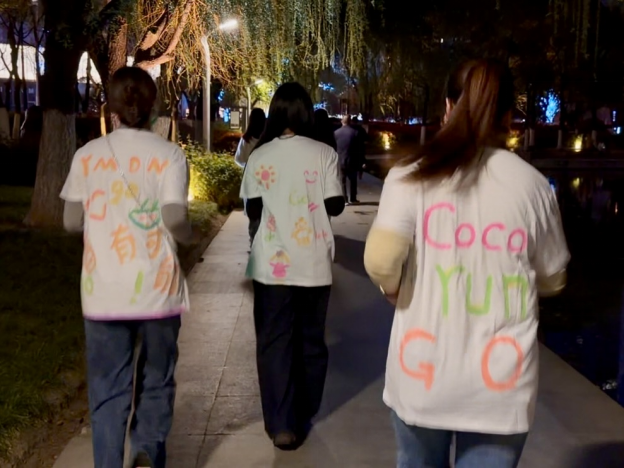 下午16时,住客们携旧T恤齐聚公寓百利厅,以荧光颜料为笔,将闲置衣物绘制成创意十足的“发光战袍”。