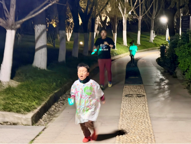 当晚19时30分,参与者身着自制战袍集结大堂,共同前往天鹅湖公园开启荧光夜跑。夜色中,一件件“发光战袍”随着奔跑的身影跃动流转,如星光洒落湖畔步道。