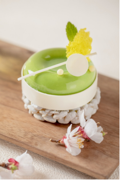 【柠檬柚子蛋糕】以四重风味缓缓递进,解锁春日清爽序曲。轻盈细腻的柠檬蛋白慕斯,入口带着柠檬的清冽果香;绵密的柚子奶酱,将柚子的清甜与奶香融合;底部可可柚子蛋糕胚口感松软,搭配酥脆的大米花脆底。