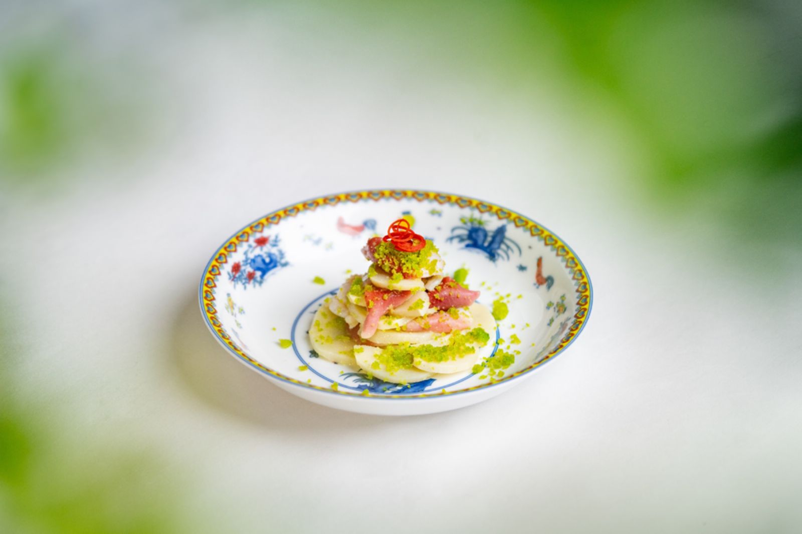 鲜嫩的北极贝,佐以花椒慢煸出香的豆酥,带来麻香酥脆的口感层次,凸显春笋的爽脆与回甘。