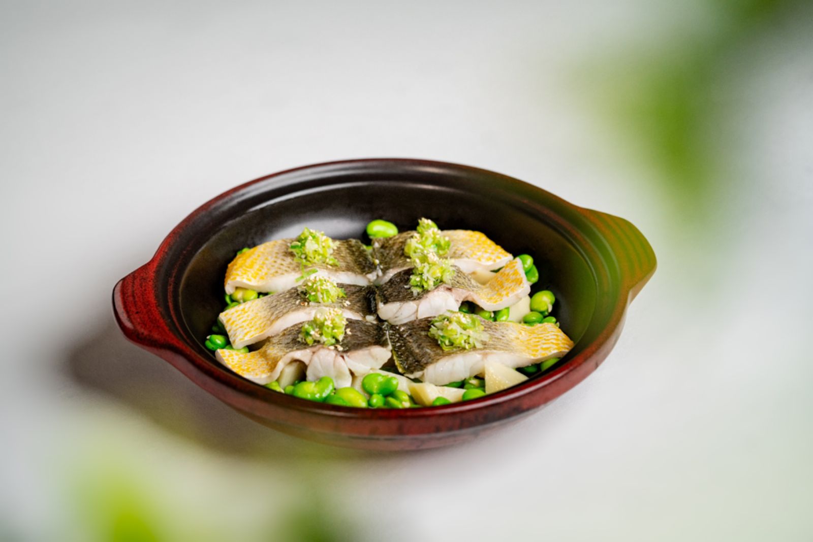 优选黄鱼经慢火焗制,肉质细嫩。搭配当季蚕豆瓣与时令兰笋,以葱油与鸡汤提味,尽显食材鲜香本味。