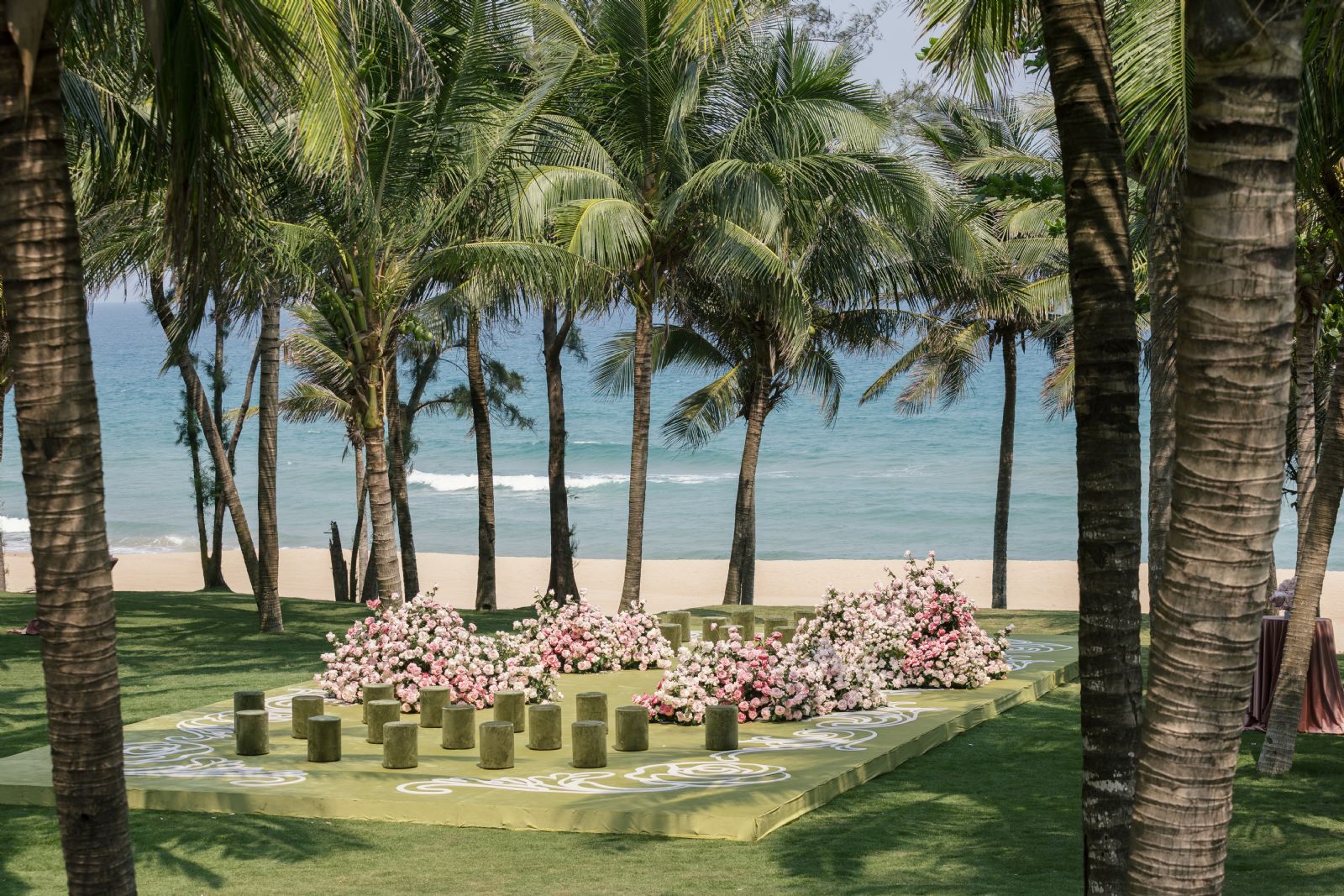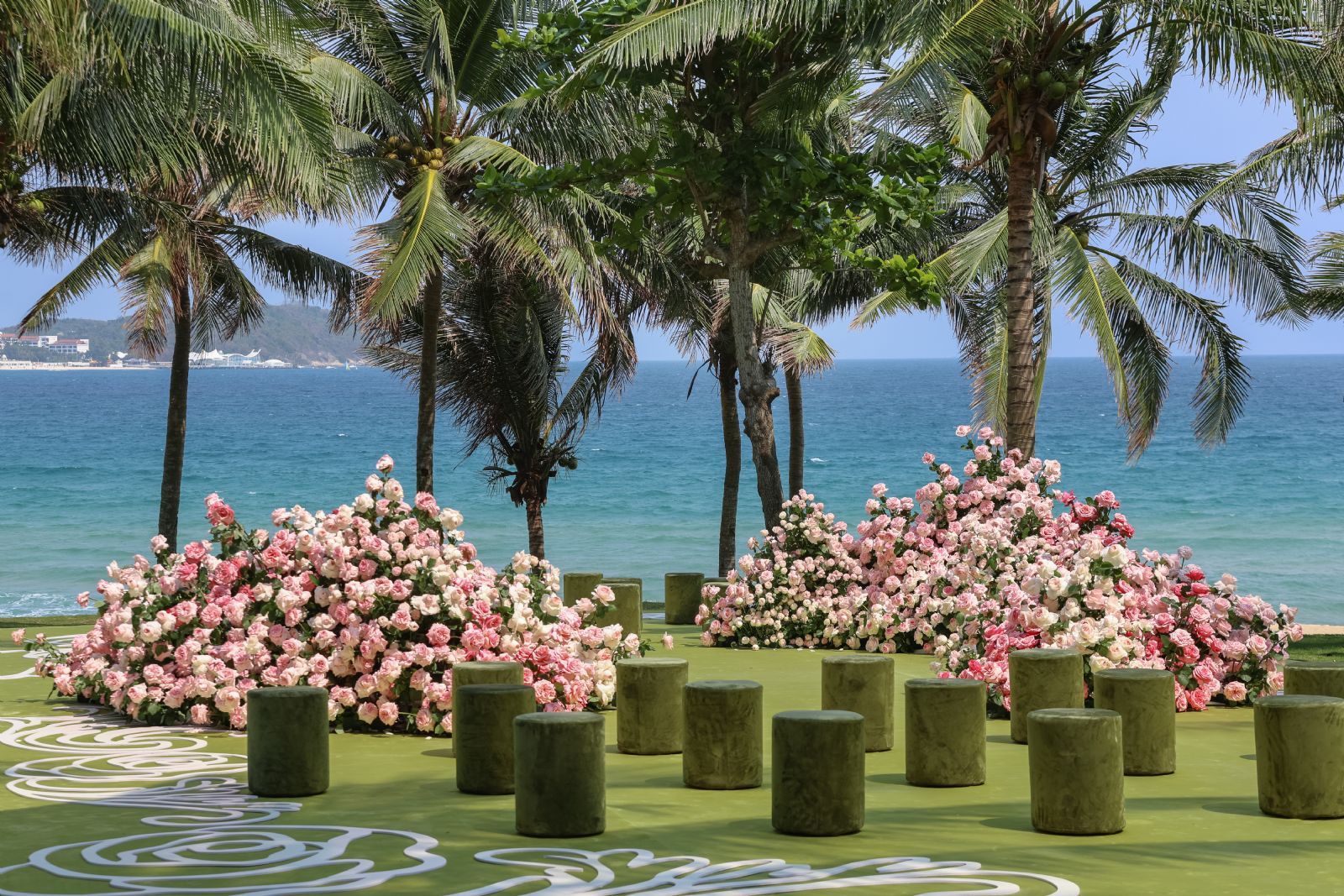 瑰夏草坪沿缓坡向海岸铺展,明亮的绿意直抵海浪翻涌的边界。蜈支洲岛静浮于蔚蓝之中,于黄昏时分披上海湾独有的玫瑰金时刻,成为仪式背景中无需修饰的天然见证。椰林间花瓣与海风流转穿梭,暮色晕染时灯火次第亮起,从白日到星夜,瑰夏草坪以不同的光影层次,盛放着每一种相聚的可能。