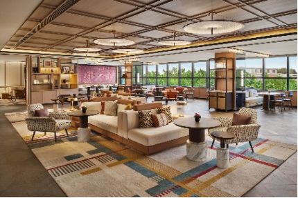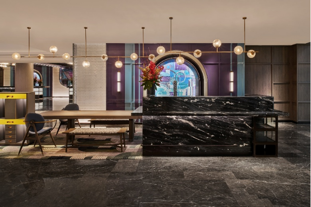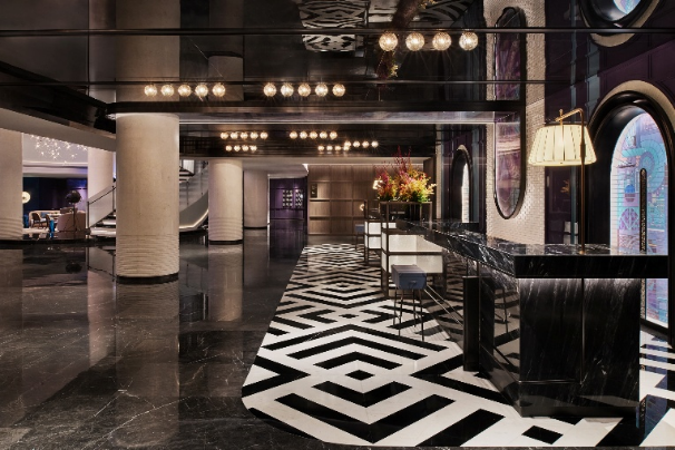 上海虹桥万丽酒店延续品牌富有戏剧张力的设计美学,并从石库门的海派建筑风格中汲取灵感,演绎上世纪十里洋场的绝代风华。酒店巧妙地将石库门场景融合华新路的洋房街景,展现上世纪上海长宁区的繁华景象,为宾客旅途中的居停注入意想不到的灵感。大堂接待处使用石库门造型,既保留着本土传统建筑的韵味,又巧妙融入了Art Deco的精髓,将门外车水马龙的市井场景抽象成充满韵律感的图案, 像是给现实披上了一层梦幻滤镜,让人还未踏入便觉摩登气息扑面而来。