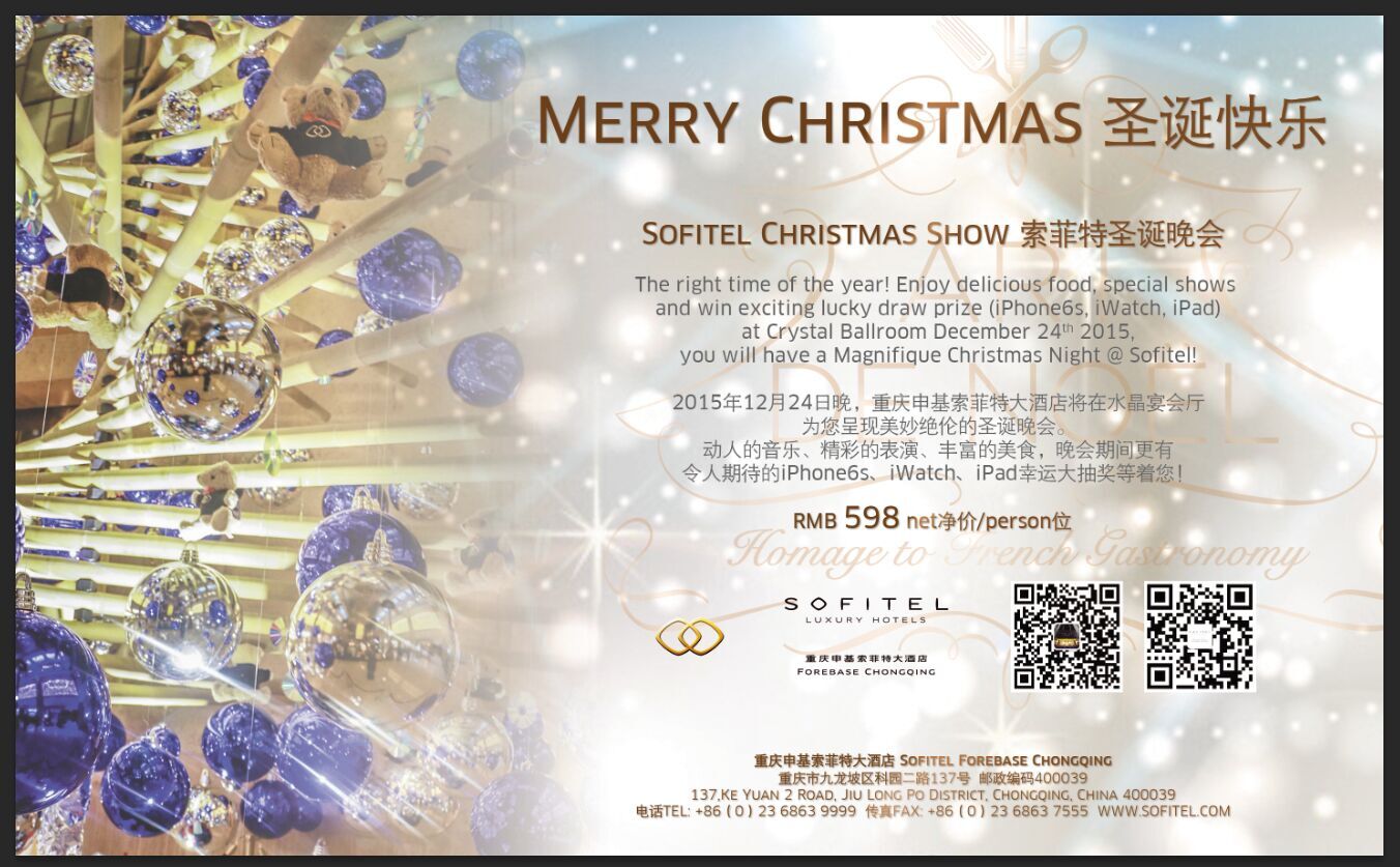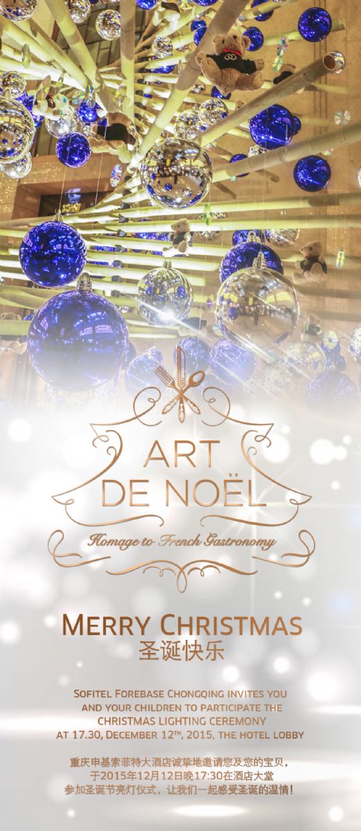 重庆申基索菲特大酒店以绝妙的美食盛宴玩转这个圣诞。顶级大厨为圣诞美食爱好者搭配横贯中西的饕餮大餐,琳琅满目的新鲜海鲜,招牌精致甜品,多种现场烹饪的鲜美佳肴以及独具东方特色的圣诞中式套餐。精彩绝伦的圣诞晚会,iPhone6s、iPad mini2各种圣诞大礼,幸运随时从天而降。亮灯仪式,“光明童行”慈善售卖活动,让这个圣诞更加温暖。酒店大堂还精心准备了圣诞姜饼屋,售卖各种精美圣诞礼品。在这里,幻想中的圣诞全都触手可及。