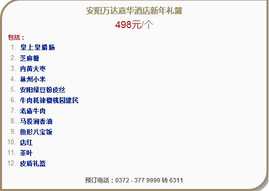安阳万达嘉华酒店特别为您甄选新年礼篮,不仅外观高端大气上档次,而且“内涵”丰富,足以成为您向挚爱亲朋和生意伙伴传递心意与真情的首选礼品。
