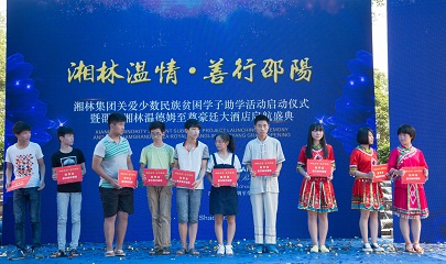 在邵阳市委统战部和团市委希望工程的共同见证下,由邵阳市光彩基金会为湘林集团授牌;同时,湘林集团及湘林温德姆酒店现场捐赠50万元,交由邵阳市希望工程管理中心监管,用于帮助贫困学生铺展梦想之路,“湘林集团关爱少数民族贫困学子助学活动”自此正式实施。