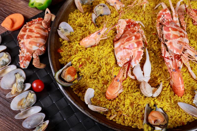 西班牙海鲜饭平底铁锅薄薄一层饭,饭底有锅巴。饭中不软不硬吃起来很香,海鲜也很嫩,海鲜饭吃过一次会让人一直怀念。