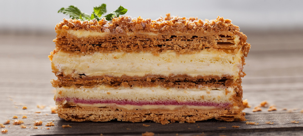 一千层酥皮,所以拿破仑又被称为千层酥。拿破仑蛋糕造价不菲,不但使用了繁杂的起酥工艺,而且酥皮之间的夹层丰富,不仅有鲜奶油,还有吉士酱。浅尝一口,甜而不腻,丝滑入心,幸福的滋味溢于言表,沉醉在脸上~
