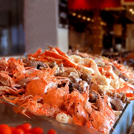 海鲜档口六七种海鲜每天轮番供应蟹脚、文蛤、大虾、三文鱼、面包蟹等等让人欲罢不能令人食指大动,垂涎三尺。