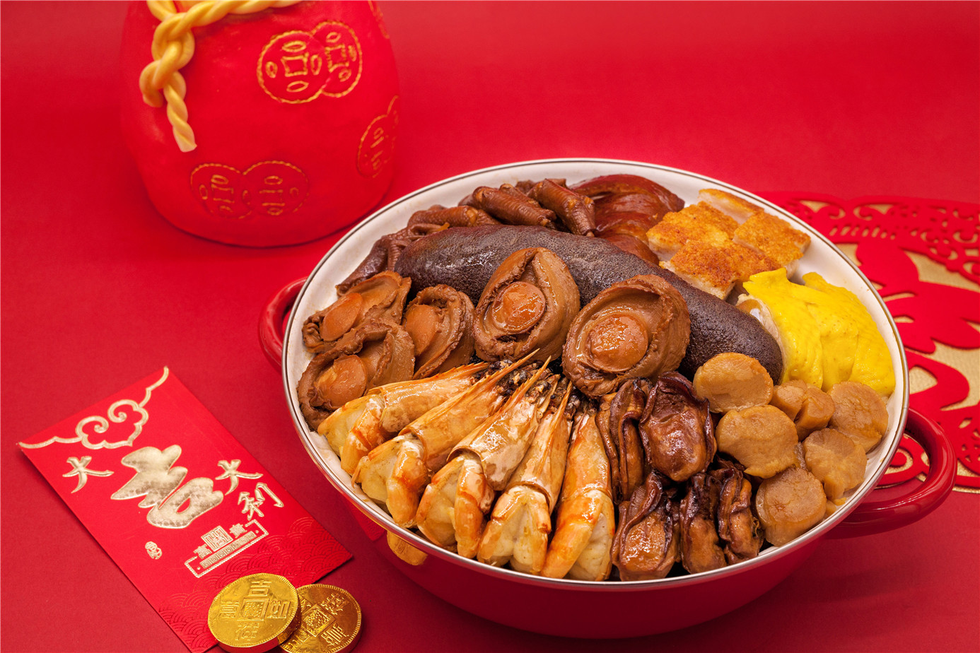如今的新春盆菜在朗廷集团米其林星级姐妹餐厅- 明阁的演绎下更有了独特的滋味。由行政总厨黄伟成先生调制秘制酱汁,选用精选农家老鸡、赤肉、排骨、鸡脚、日本干元贝、章鱼、鹅掌等近10款食材,经过炸制后浸入上汤之中,先大火后小火煲制16小时以上,再放入直径长达80厘米的大锅中用巨型锅铲大力搅拌翻转,至所有鲜香味完全融合在汤汁里,最后大火收汁过滤萃取,此时酱料口感醇厚、浓郁鲜香、色泽金黄,入口似有似无。最后一道工序就是将秘制酱汁淋在精挑细选的丰富食材上,五头极品鲍、大鹅掌、日本干贝、沙碱蚝豉、客家咸鸡、港式烧鹅、深海大明虾、猪手、日本大花菇、白萝卜、发菜等组成了5层风味,再一层一层吃下去,汁液交融,回味无穷。食物相容,人心相交,此刻正为团圆而凝聚。