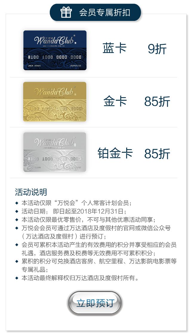 即日起,新老会员通过万达酒店及度假村官网或微信公众号(万达酒店及度假村)预订客房即可享受尊贵礼遇: