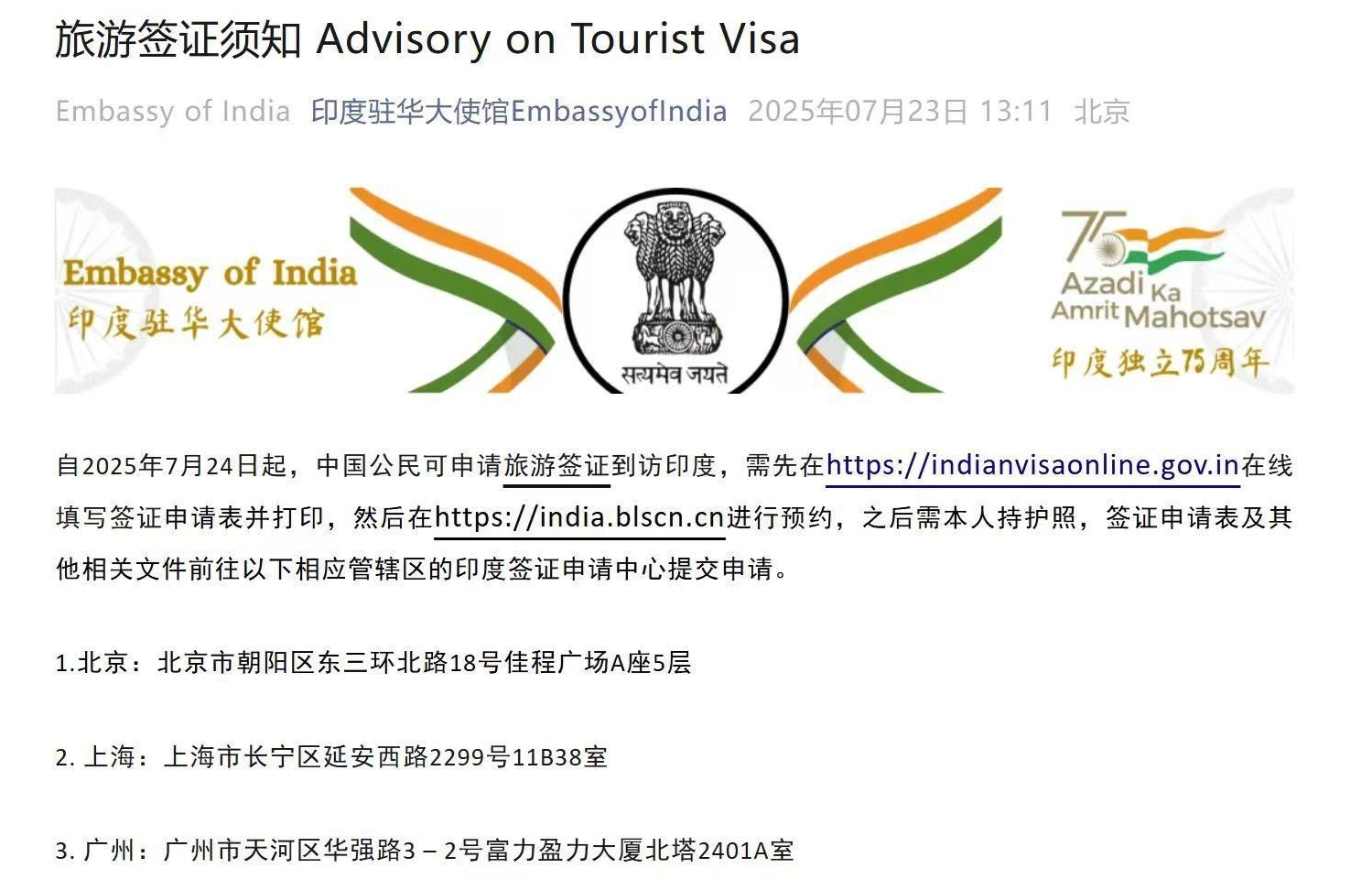 7月23日,据印度驻华大使馆消息,自2025年7月24日起,中国公民可申请旅游签证到访印度,需先在线填写签证申请表并打印,然后进行预约,之后需本人持护照、签证申请表及其他相关文件前往以下相应管辖区的印度签证申请中心提交申请。