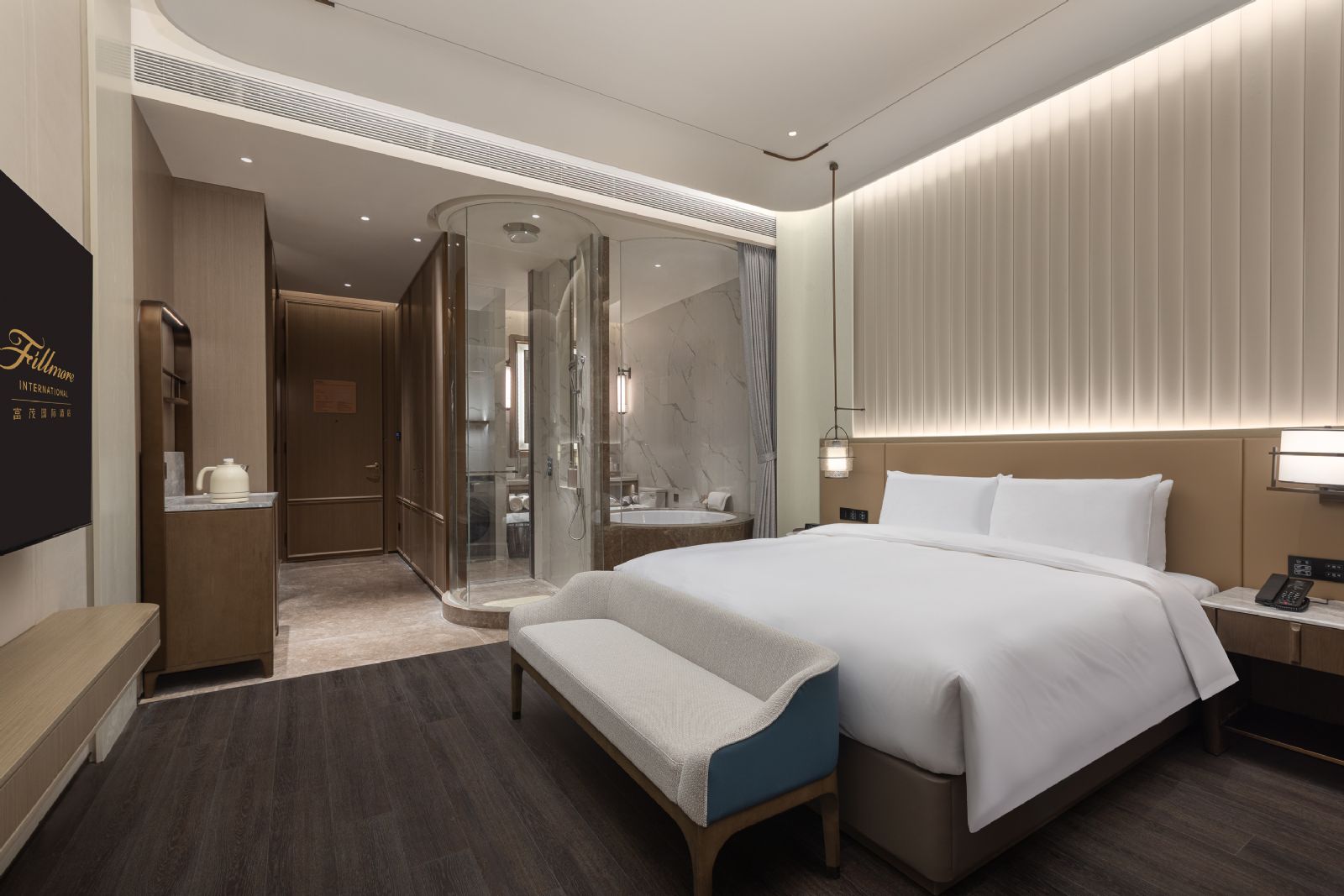 酒店拥有百余间豪华客房,配备软硬两面舒适床垫、洗烘一体机、TOTO浴缸及智能家居系统,提供管家式服务与高端洗护用品,演绎海派贵族奢华体验。