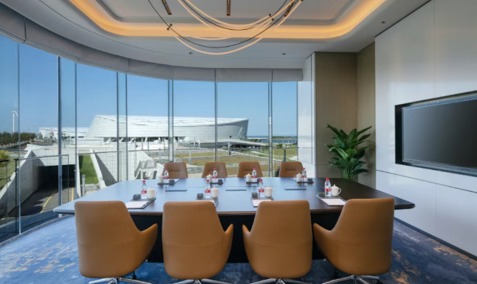 设施方面,我们以 “山海文化融合” 为设计理念,将海洋元素融入每一处空间:拥有 328 间现代风格客房,每间都配备独立商务办公区、智能客控系统和高速网络,更通过全景落地窗设计,让宾客躺在床上就能欣赏湖海交织的美景。