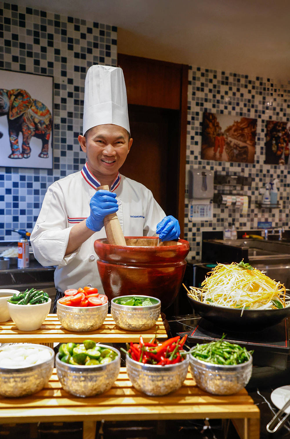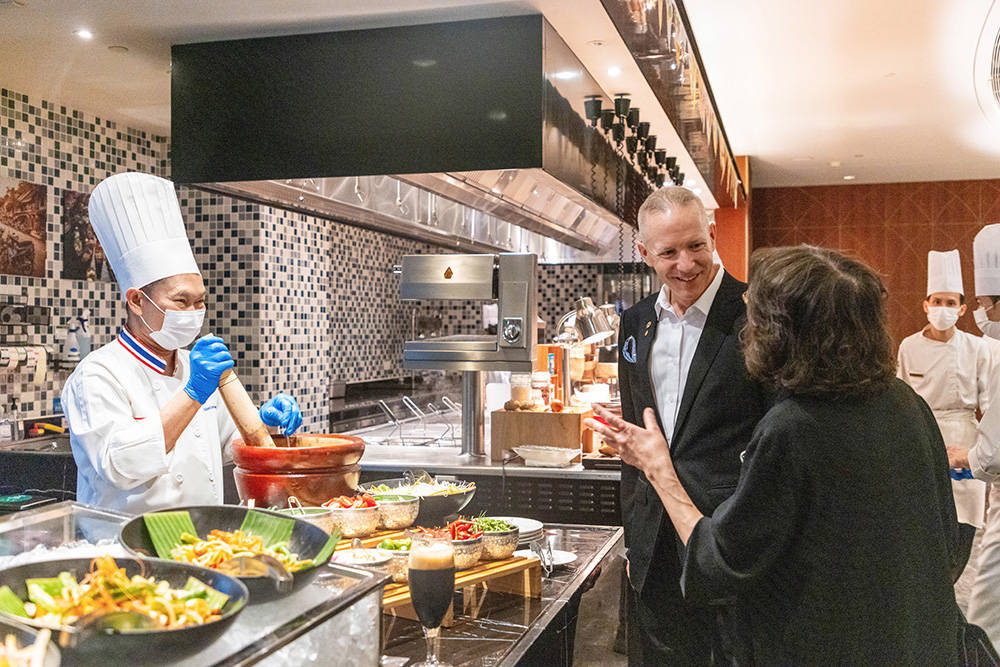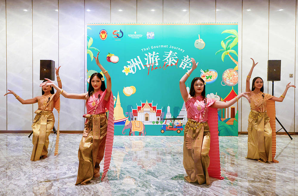 开幕式当晚,现场洋溢着浓郁的异域风情。泰王国驻广州总领事馆总领事Mr. Kajtiti Wiwatwanont(沈勇俊先生)亲临现场,与广州保利洲际酒店总经理Mr. Bruno Bohl共同主持启动仪式。特邀泰籍明星主厨Mr. Wirat Narongchai,Chef Alek坐镇现场,展示其精湛的烹饪技艺,为宾客呈现多道经典泰式料理。文化展演呈现精彩纷呈的传统民族风俗盛宴,伴随域民族乐韵,舞者翩跹起舞,营造原汁原味的泰国风情。