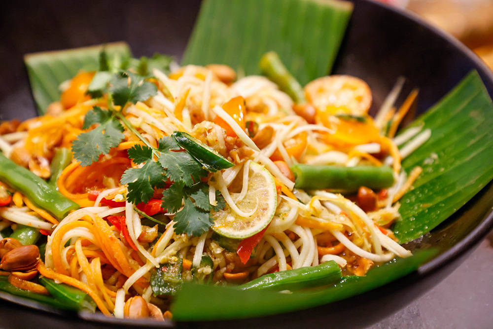 开胃菜中的青木瓜沙拉选用泰国青木瓜与特色虾米,搭配现捣青柠汁,酸辣爽口;甜品中的芒果糯米饭更采用泰国蛇牙糯米与当季芒果,淋上特制椰浆,软糯清甜。