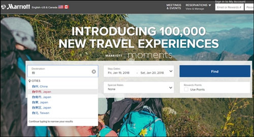 在万豪英文版网站页面输入“台”字,下拉菜单中出现中国台湾的“台中市”、“台南市”和“台东(县)”,竟然都被标明所属于日本。