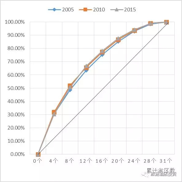 第一,酒店分布集中程度已逐步定型,仅有轻微的更深度聚集的趋势。图2中洛伦兹曲线显示,酒店数量排名前四的省市占有整体酒店的 30%左右比重,前8名的省市占有大约50%的比重,集中程度较高。三条洛伦兹曲线变化趋势说明十年间的变化并不明显,只有细微的外凸趋势。