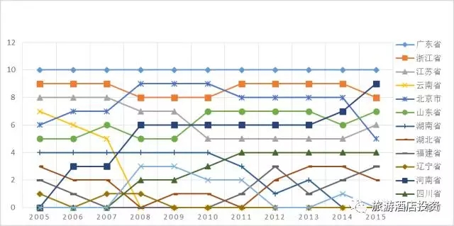 第二,酒店集中的中心在不断发生着变化,中西部城市在逐步追赶上来。结合集中度指数曲线,发现虽然酒店数量按降序排列后累计达到一半时的省市数量保持不变或者会减少,但会出现新的省市或者酒店数量排名会发生变动。广东省和浙江省一直名列前茅。中西部省市则在十年间不断发展,河南省的酒店数量排名从2005年十名开外上升到2015年的第二名,四川省、山东省等省份的排名都有上升。中西部酒店建设在加速,酒店地域分布趋向均衡化。