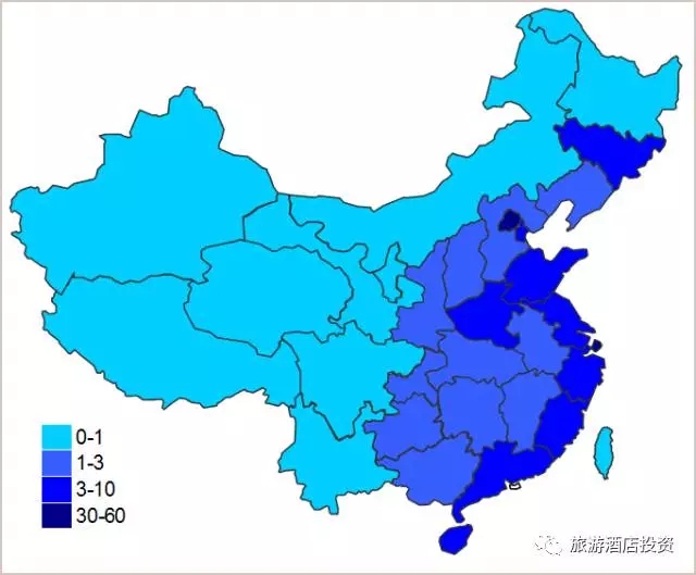 中国各省市酒店分布密度图(不包括港澳台地区)
