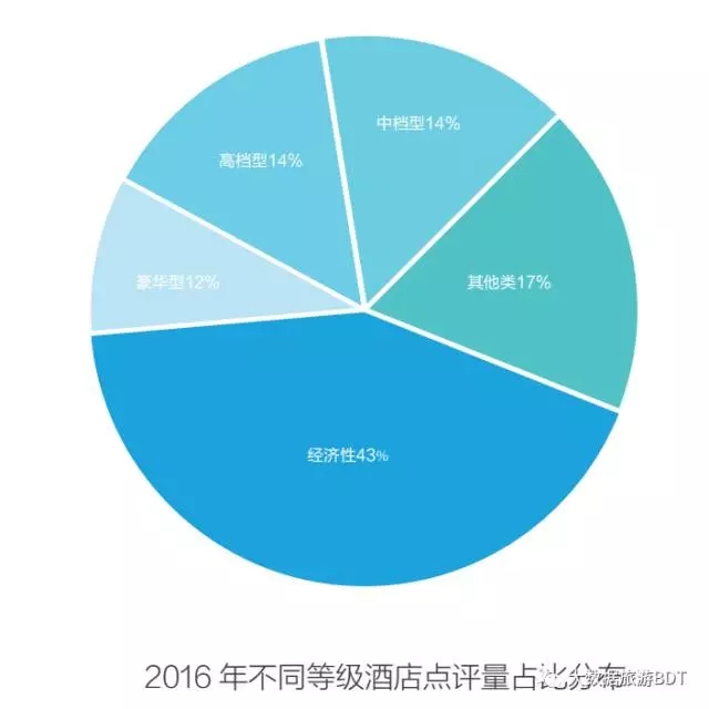 全国酒店,中高档酒店占比为8%,经济型酒店占比为19%;2016年中高档酒店点评量占总点评量的40%,经济型酒店点评量占比为43%,从数据上可以看出星级酒店的消费者更爱分享自己的入住体验,当然这与酒店管理者对网络口碑的重视程度密不可分。网络点评是低成本共享信息的渠道,酒店运营者们更要利用这种渠道提高自己的声誉和消费者忠诚度。
