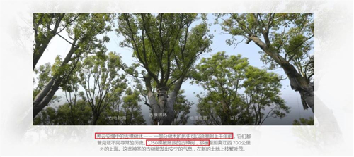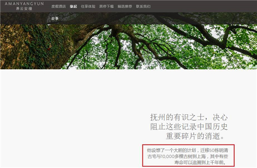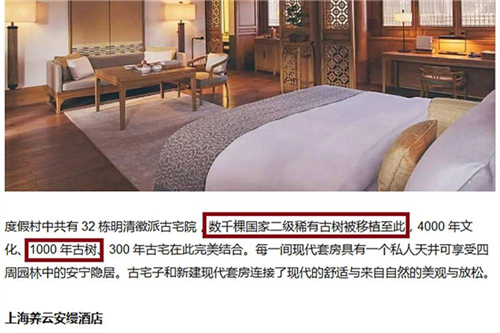 再说另一方面宣传报道。“1万棵古香樟”在酒店范围内还是也包括酒店范围外,在这一波酒店开业宣传之前,就有一些媒体援引了来自安缦官方的消息进行报道,有网站截屏等为证。其中一个截屏显示,“度假村中共有32栋明清徽派古宅院,数千棵国家二级稀有古树被移植至此”。抛开这些报道不说,仅就这次开业新闻宣传稿件中,“10000棵古香樟”、“这片千年香樟林”、“万余株千年古树”、“这棵堪称众古树首领的樟树王,树龄逾千年”等前后措辞不一、甚至矛盾的词句也真叫人迷惑。