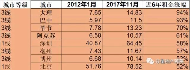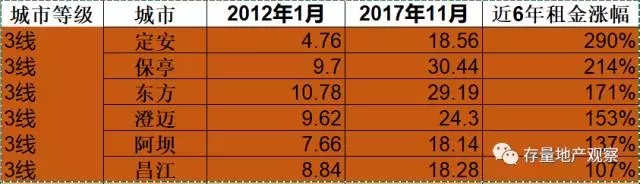 下表是近6年来租金涨幅超过100%的城市,其中定安以290%涨幅雄踞榜首,且所有城市都是三四线城市。