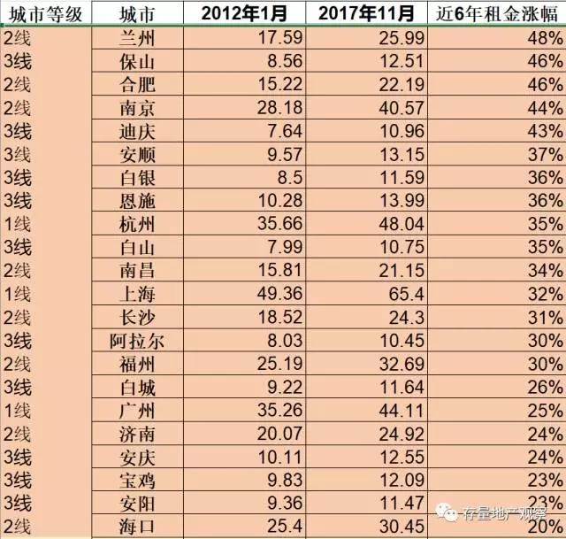 上海近6年租金涨幅只有32%,广州近6年租金涨幅只有25%,准一线杭州的租金涨幅是35%,甚至都不如二线内陆城市兰州48%的涨幅。