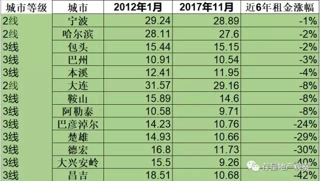 5.近6年租金涨幅为负值的绝大部分是三四线城市,但也有个别二线城市名列其中