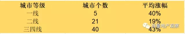 通过计算可知,一线城市租金平均涨幅是40%,二线平均涨幅是19%,三四线是43%,三四线平均涨幅高于一线,远高于二线。