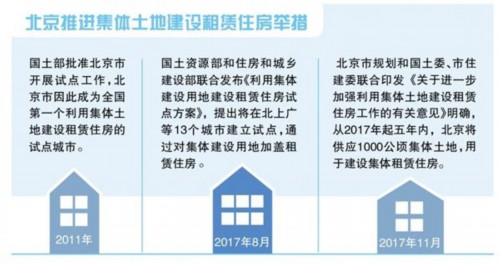 对于推进集体土地建设租赁住房,北京一直走在全国前列。早在2011年,北京市就已经向国土资源部提出利用集体土地建设公共租赁住房的试点申请。同年,国土部批准北京市开展试点工作,北京市因此成为全国第一个利用集体土地建设租赁住房的试点城市。2017年8月28日,国土资源部和住房和城乡建设部联合发布《利用集体建设用地建设租赁住房试点方案》,提出将在北上广等13个城市建立试点,通过对集体建设用地加盖租赁住房,实现土地存量进一步高效利用。同年11月16日,北京市规划和国土委、市住建委联合印发《关于进一步加强利用集体土地建设租赁住房工作的有关意见》明确,从2017年起五年内,北京将供应1000公顷集体土地,用于建设集体租赁住房。