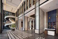 为了不辜负这样山水相依的好环境,酒店建筑设计自然是要有与之匹配的美。新昌安岚特邀国际著名专精奢华酒店设计的HBA团队进行建筑与室内设计。整体建筑采用了简洁而现代的线条,结合本地石料与木材建成。整片高大的玻璃墙将自然光线和秀丽景色巧妙带入到室内空间,令宾客无论身在何处,都能零距离亲近自然。