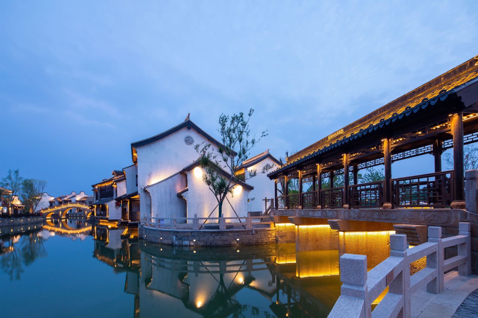 酒店客房以南宋仿古建筑风格为主体以独栋或组合的形式沿河分布在景区各个岛屿上。小桥流水、戏台、古街相映成趣,书院、酒楼,河埠乐坊一应俱全。