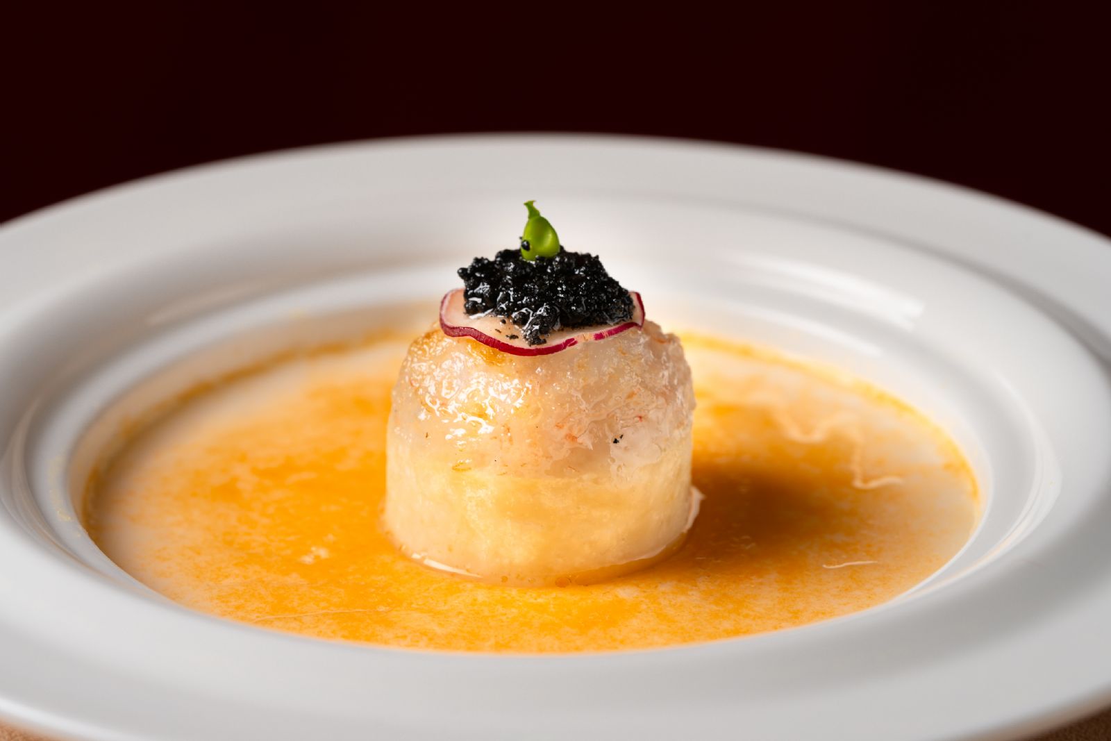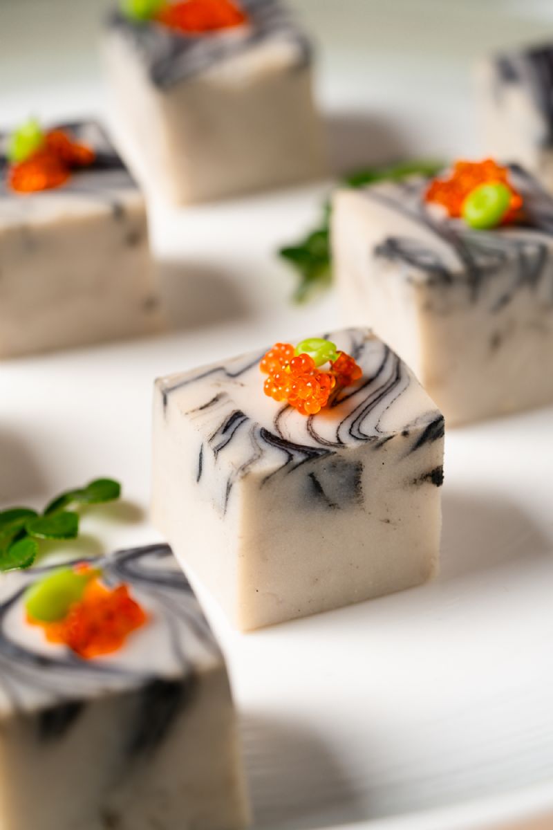 开篇之作北极贝雪梨丝,便颠覆了传统前菜的想象。主厨摒弃繁复调味,让北极贝的海洋鲜甜与雪梨的脆爽清润直接对话,口感对比鲜明,风味纯净而充满张力。与之相映成趣的花岗岩荔浦芋头,则展现了主厨对形态与质感美学的追求。芋头经过精心蒸煨,呈现极致的粉糯绵密,以类似泼墨山石的意境呈现,顶部点缀的鱼子酱如露珠般晶莹,咸鲜的爆发力瞬间提升芋头的醇厚本味,演绎了一曲土地与海洋的协奏。