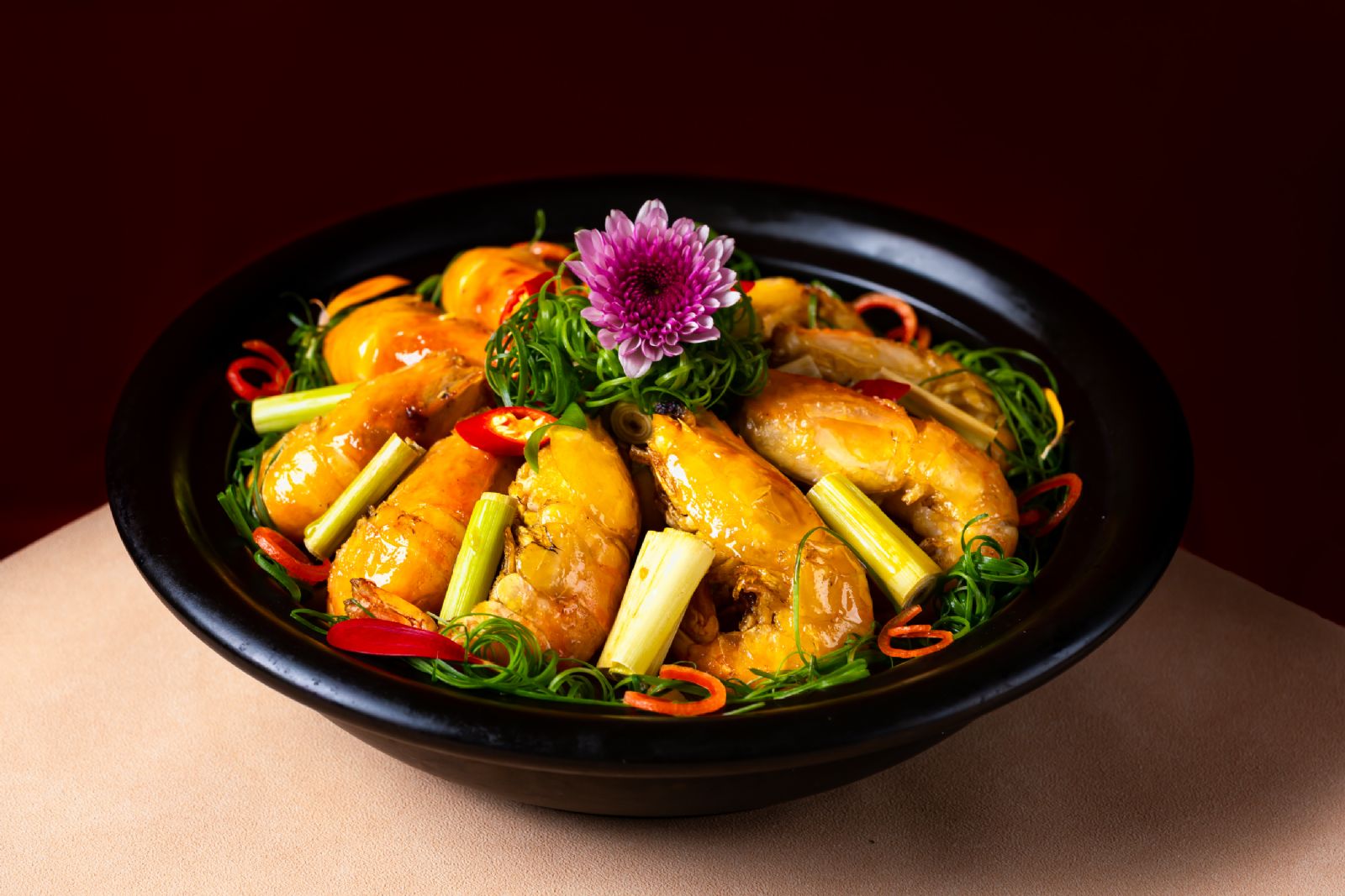 在主菜部分,唐汉先生展现了其驾驭传统与创新的高超能力。榄豉酱蒸桂花鱼,回归粤菜蒸制精髓,选用独家发酵的醇厚豆豉,是“咸中提鲜”的经典粤菜智慧的当代呈现。而鲜香茅黑椒焗罗氏虾则是一次大胆的“风味嫁接”。东南亚特色的香茅与黑胡椒激情碰撞,通过粤菜特有的“焗”烹技法,将浓烈香气逼入饱满的虾肉之中,锁住本真汁液,创造出兼具异域风情与粤式镬气的复合型美味。