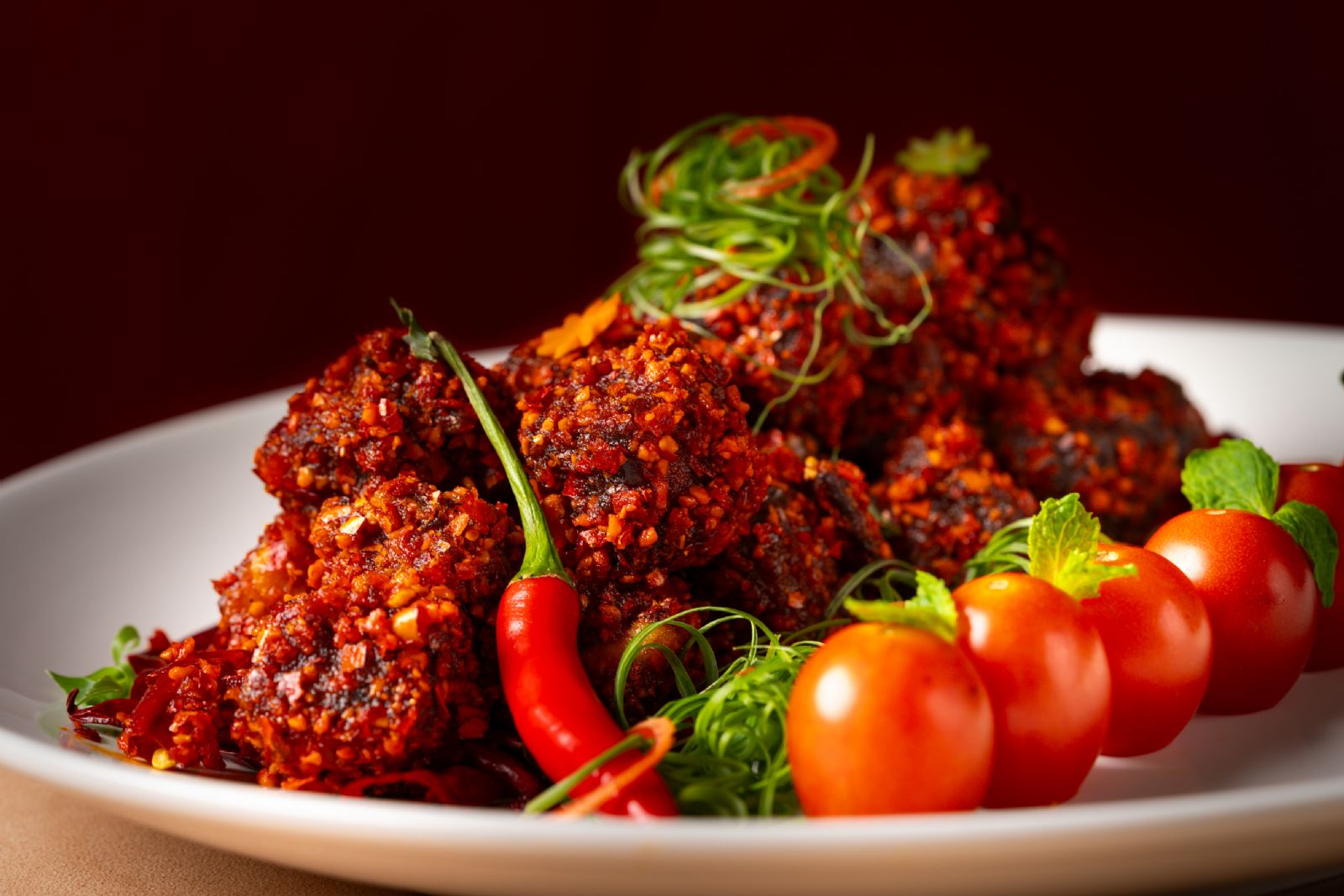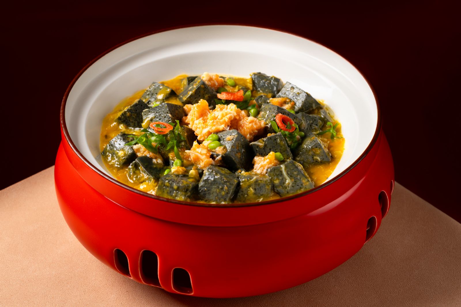 菜单中尤为引人注目的是几道跨越菜系边界的创意之作。金汤蟹粉烧黑豆腐,豆腐的豆香深邃,与河鲜的极致鲜美在浓郁汤汁中达到完美平衡。椒麻脆椒牛小排更是体现了主厨的巧思。精选的牛小排以精准火候煎至外焦里嫩,裹上以粤式炒制工艺处理的脆椒与汉源花椒,麻辣酥香附着于丰腴肉排之上,粤式的精准火工完美承载了川味的豪放灵魂,堪称一次成功的风味对话。