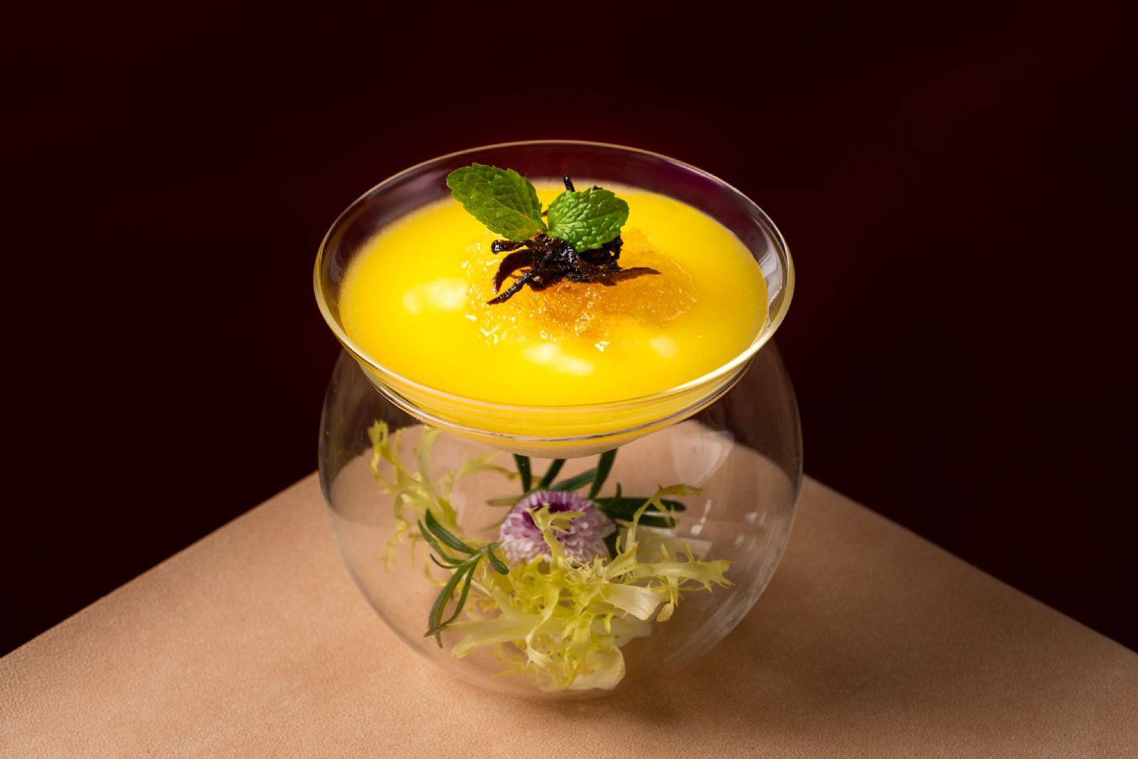 在一系列浓墨重彩的演绎后,百花带子蒸芙蓉蛋以返璞归真的姿态出现。极致滑嫩的蒸蛋如同画布,承托着手打虾滑与鲜带子构成的“双鲜”组合。这道菜摒弃了所有冗余调味,纯粹依靠食材品质与烹饪火候取胜,是主厨对粤菜核心精神——“鲜”字最朴素、也最深刻的致敬。餐宴的尾声,以一道陈皮蜜雪燕芒果米浆收束。口感层次丰富,余韵温和悠长,为这场风味探索之旅画上一个圆满而温柔的句号。