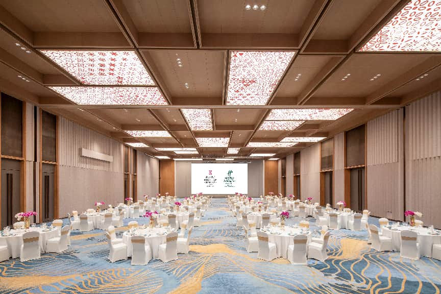 除此之外,酒店群拥有独立的咸阳国际会议中心,位于两家酒店中间位置,共三层,灵活多元的会议与展览空间结合8米挑高空间、两个千平宴会厅及多间多功能厅、高清大屏和灯光音响系统,可以满足不同活动类型及需求。