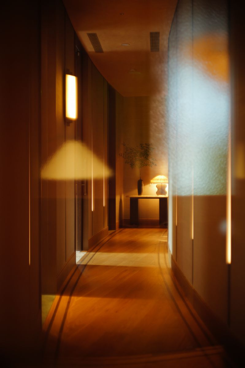 继续前行,是一段明亮的走廊。走廊一侧的大面积水波纹玻璃将自然光线引入室内,增加空间的通透感,另一侧则可透过玻璃看到敞亮的开放式厨房,驻足在此欣赏厨师们的精彩技艺,为盛宴增添一份期待感。